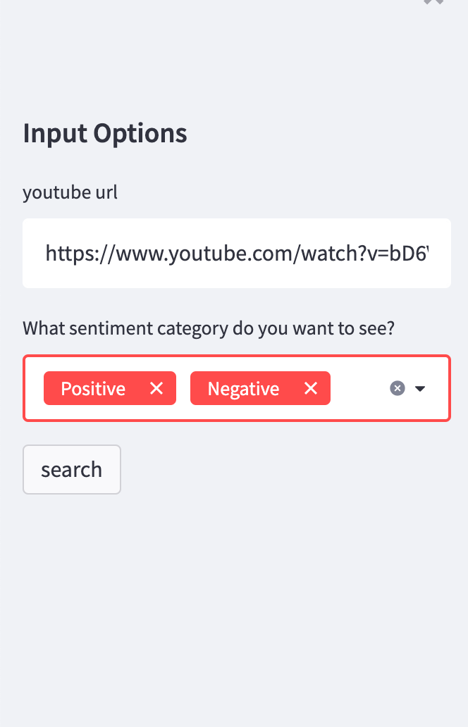 처음 시작 페이지를 보면 youtube url과 어떤 감성 카테고리를 볼 것인지 선택할 수 있다.